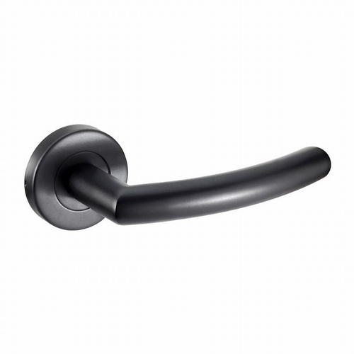 Curved mitred matte black door handle on a 2 piece covered sprung rose.